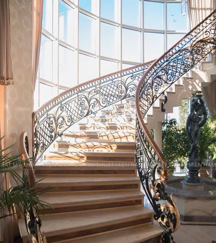 Vẻ đẹp của lan can sắt mỹ thuật chỉ thực sự thăng hoa khi được kết hợp hài hòa với các yếu tố khác trong không gian như màu sắc, tay vịn và bậc cầu thang.